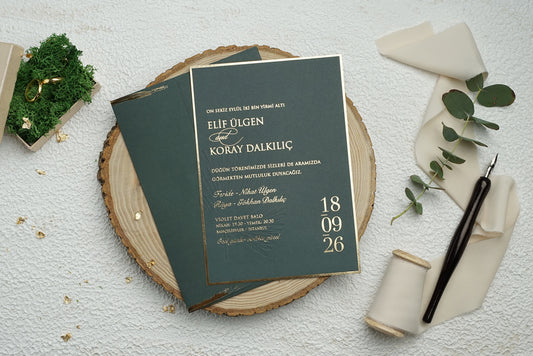 Altın ve gümüş varaklı düğün davetiyeleri, lüksü ve ihtişamı temsil eder. Gösterişli ve sofistike tasarımlarımızla davetiyeniz parlayacak ve unutulmaz bir izlenim bırakacaktır.