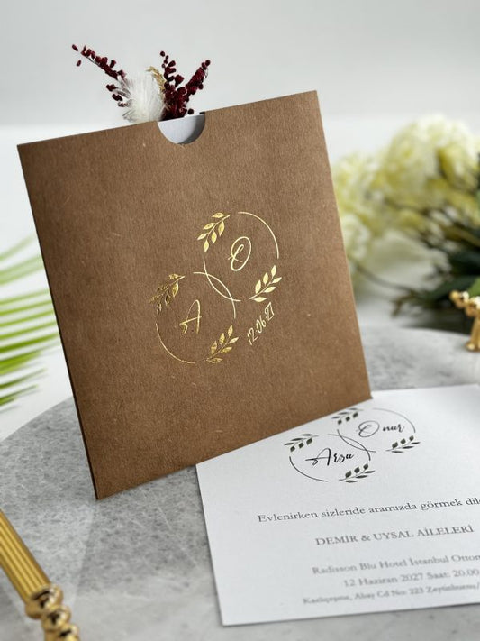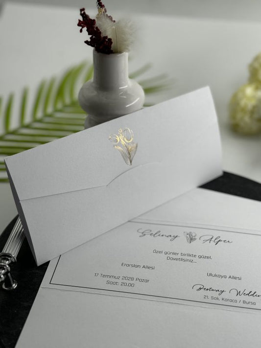 Altın ve gümüş varaklı düğün davetiyeleri, lüksü ve ihtişamı temsil eder. Gösterişli ve sofistike tasarımlarımızla davetiyeniz parlayacak ve unutulmaz bir izlenim bırakacaktır.